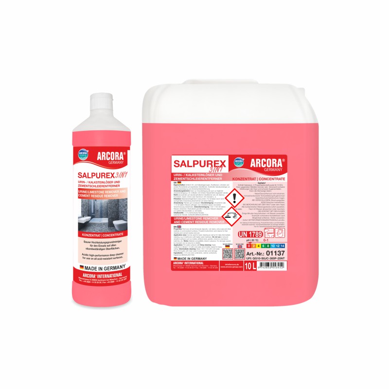 SALPUREX 3IN1 can be used for basic cleaning as well as for daily intermediate cleaning, e.g. inbathrooms with higher water hardness. Do not use on all acid-sensitive surfaces such as marble, artificial stone, granite, chrome,enamel, zinc, nickel, aluminium, toilet lids, etc.